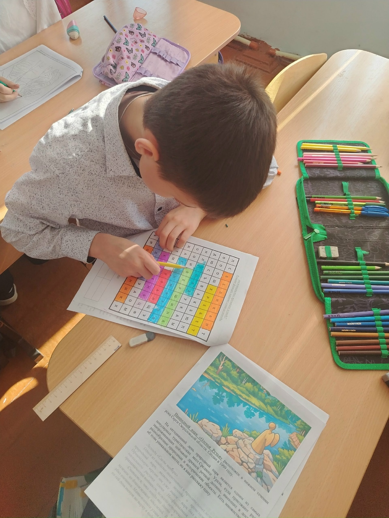 Занятие не ограничилось лишь пассивным просмотром картинок. Ребята получили первые практические задания из журнала «Орлёнок-Эколог». Им нужно было представить угрюмого великана и охотника, нарисовать их, а также решить филворд. Это помогло закрепить полученные знания и стимулировало творческое мышление.